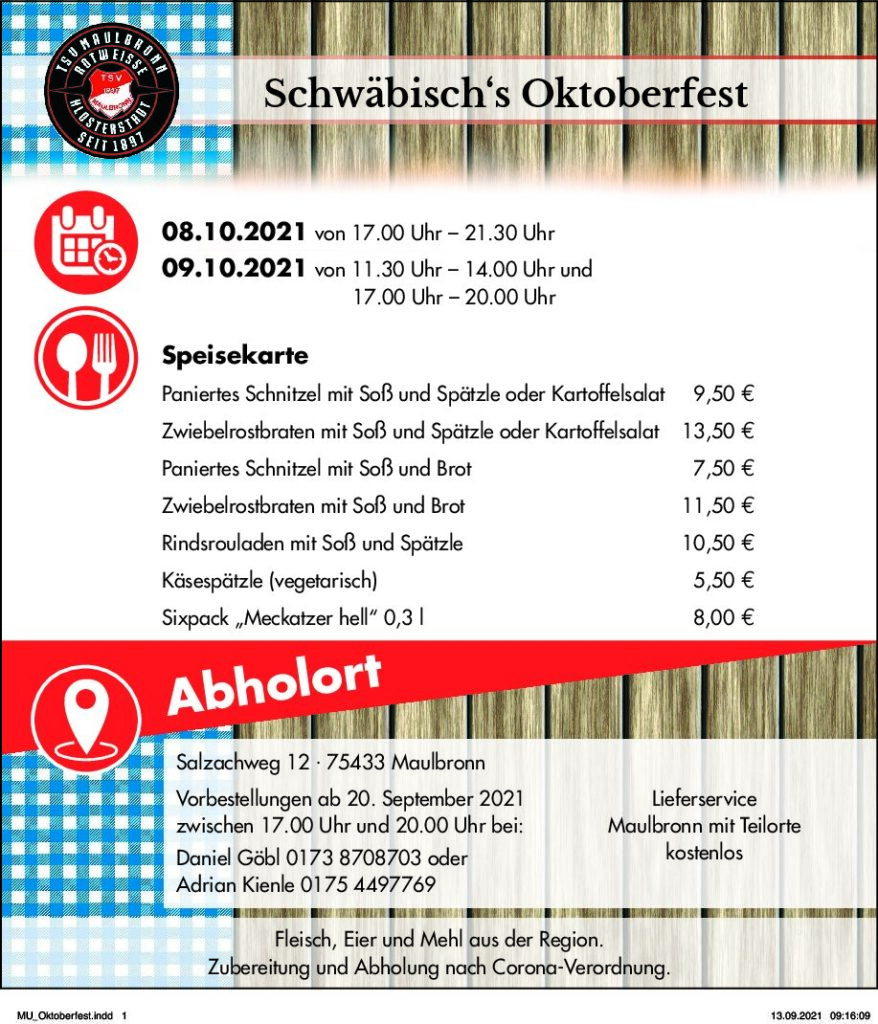 Auch diese Jahr findet das beliebte Schwäbische Oktoberfest vom 8. bis 9.10.2021 statt Wir freuen uns auf Eure Bestellungen MU_TSV_Maulbronn_Oktoberfest_2021