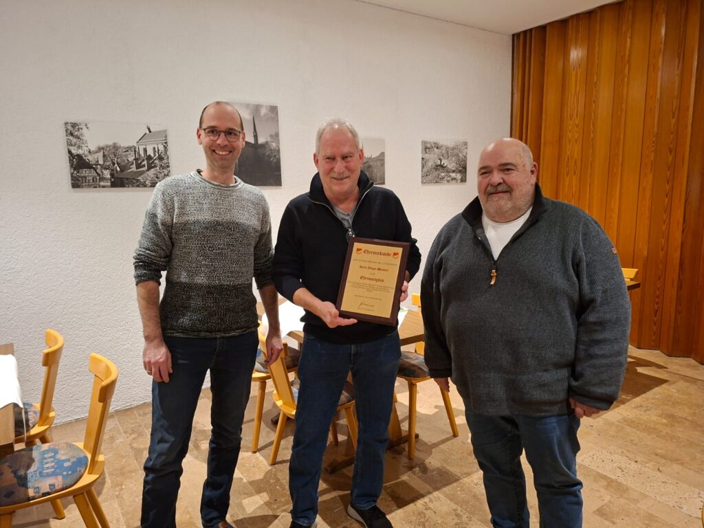 In Anerkennung und Würdigung für seine langjährigen außergewöhnlichen Verdienste um den Verein wird Herr Jürgen Weissert einstimmig mit dieser Ehrung ausgezeichnet und ihm die Urkunde der Ehrenmitgliedschaft mit dankenden und Worten der Wertschätzung durch Herrn Glasbrenner überreicht.